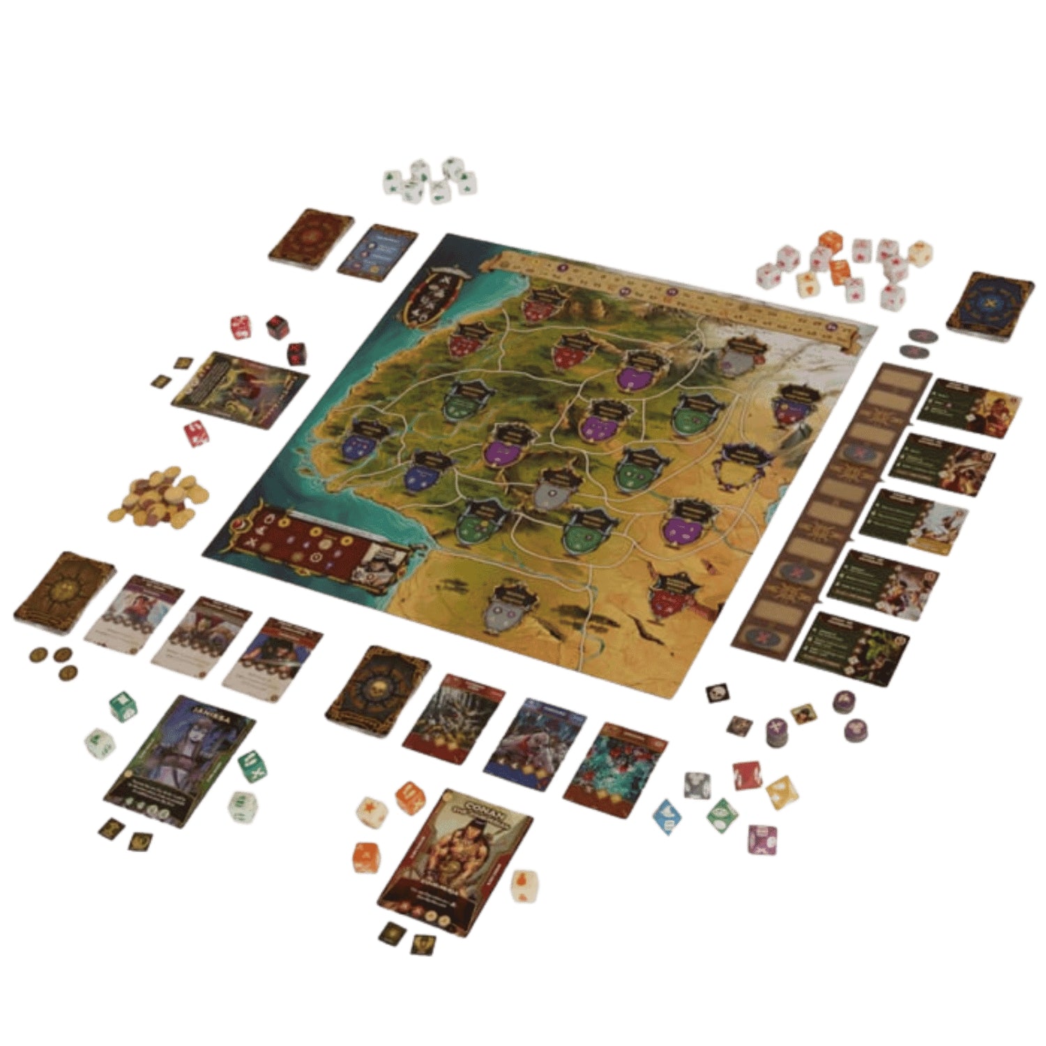 During a game of The Adventures of Conan you will travel through kingdoms controlling the heroic barbarian Conan, one of his powerful allies, or a scheming foe. Using your custom dice you will pray to the gods for power, explore the world seeking combat and training, and carry out adventures and encounters to unlock bountiful rewards.