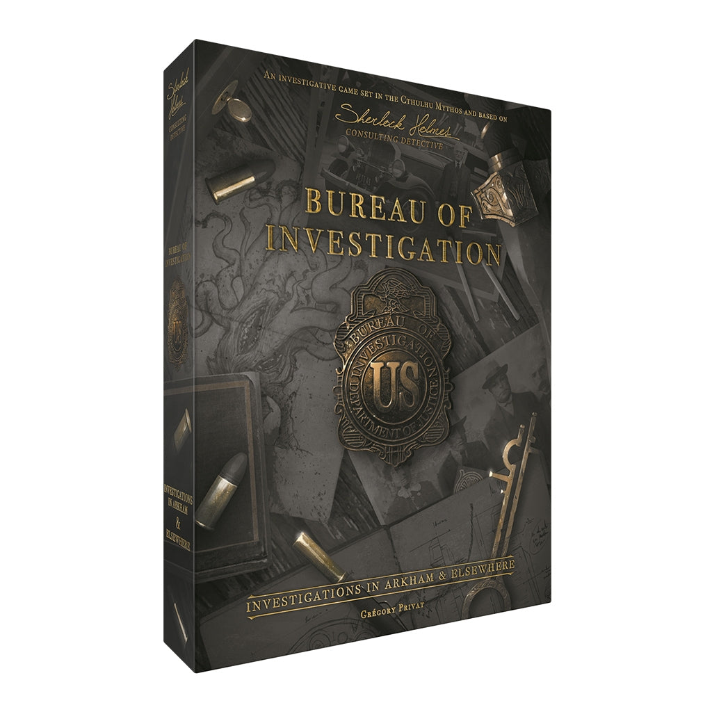 Bureau of Investigation: Investigations in Arkham & Elsewhere is a complete and independent investigation game set in the Cthulhu Mythos. These cases transport you into the United States of America in the 1920s to tear the veil dissimulating unspeakable threats from Elsewhere. The game is based on the rules of Sherlock Holmes Consulting Detective, with a few added new investigative mechanics.