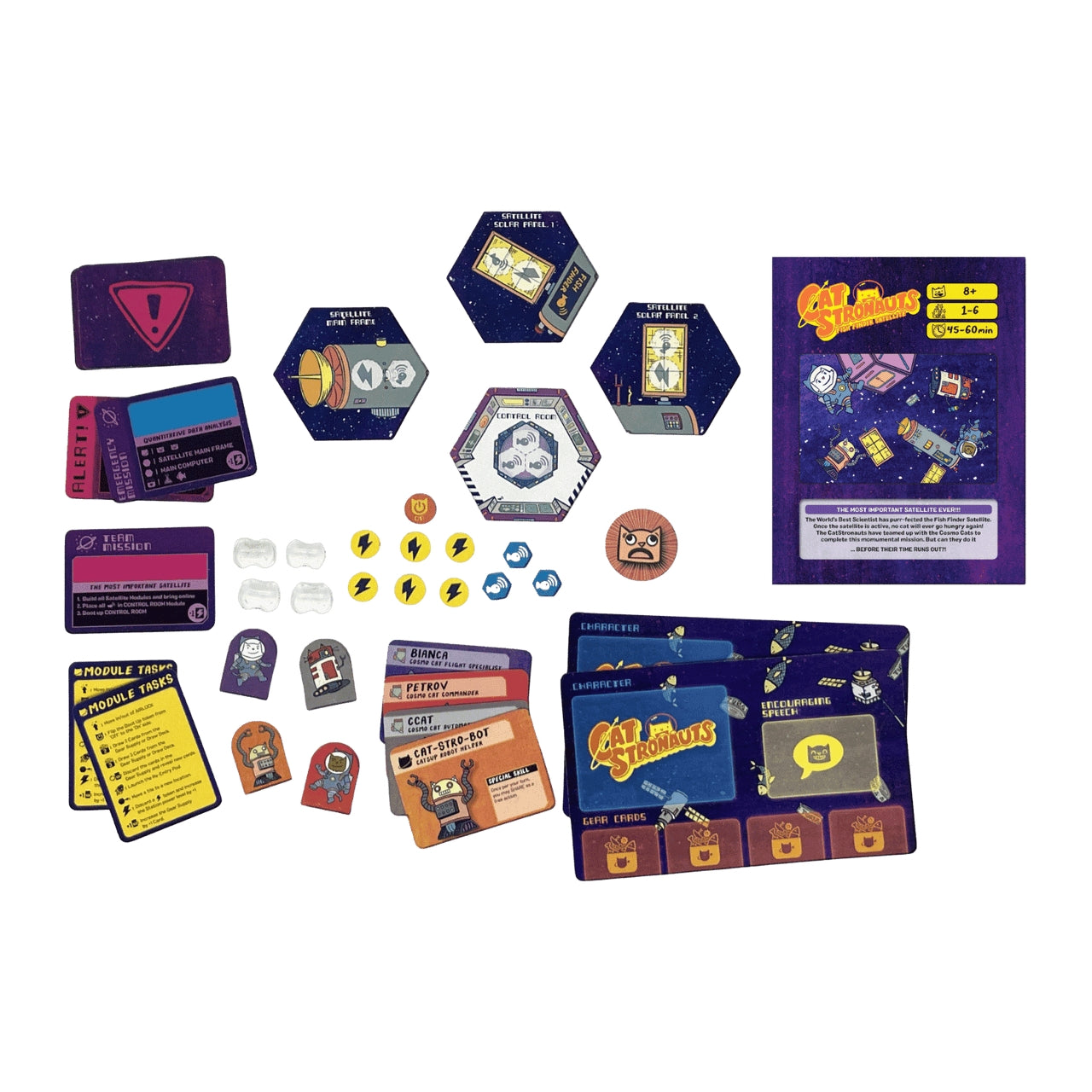 This expansion adds the new core mission Fish Finder Satellite. You'll need to build all the Fish Finder Satellite modules, program the satellite, then activate it! But don't forget, you still need to finish your other core mission, too! You'll need to work as a team and communicate extra well to get all your tasks done before time runs out. But with more characters to play with, we know the Earth is in safe paws!