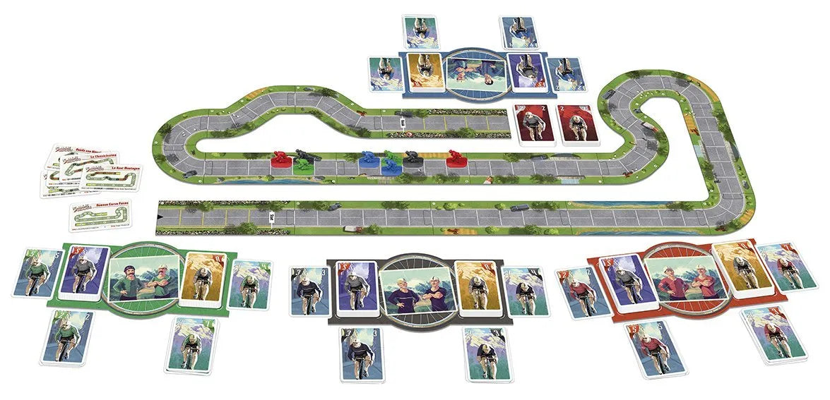 The leaders round the last corner and head for the finish line! Each team has used cunning and skill to position their Sprinter for this moment, but only one has done enough to pull off the win! Flamme Rouge is a fast-paced, tactical bicycle racing game where each player controls a team of two riders: a Roller and a Sprinter. The goal for each player is to be the first to cross the finish line with ONE of their riders. Players move their riders forward by drawing and playing cards from that riders specific deck, depleting it as they go. Use slipstreams to avoid exhaustion and position your team for a well timed sprint for the win! Flamme Rouge is the ultimate tactical racing game!
