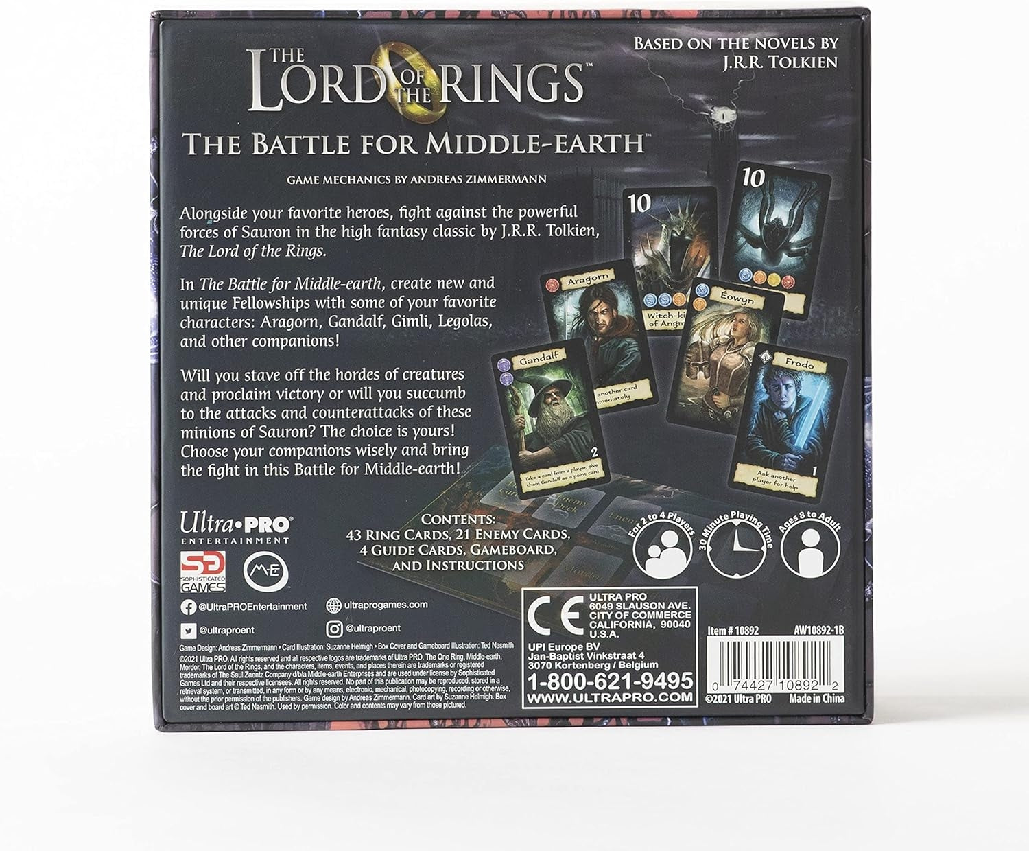 Fight along side your favorite heroes from JRR Tolkien's high fantasy classic, The Lord of the Rings, against the powerful forces of Sauron in The Battle for Middle-earth. To defeat your enemies, you must create your own Fellowships of Companion Cards and send them into battle. Despite having numerous Companions to aid your attack, the Eye of Sauron is always vigilant and you must beware of a Counterattack by the Enemies of Mordor. The player who defeats the most dangerous Enemies, and collects the greatest number of victory points, wins the game.