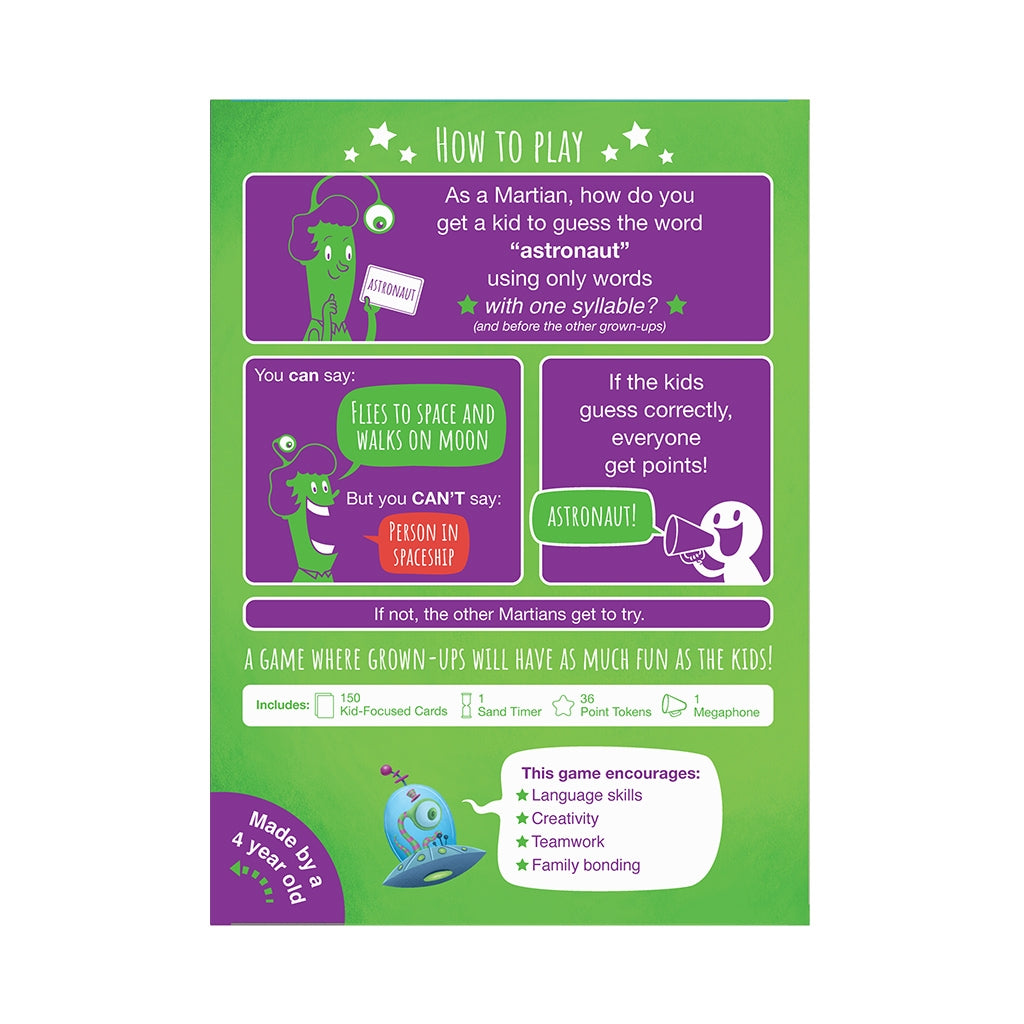 The kids are Human, the grown-ups are Martians, and everyone’s laughing! The goal is for the Martians to get their Human friends to guess a word by only using clues with single-syllable words. The Humans have to work together to make sense of your silly speech before the timer runs out. This game is an out-of-this-world way to improve your little ones’ teamwork and language skills. Perfect for small family game nights or breaking the ice at big gatherings.