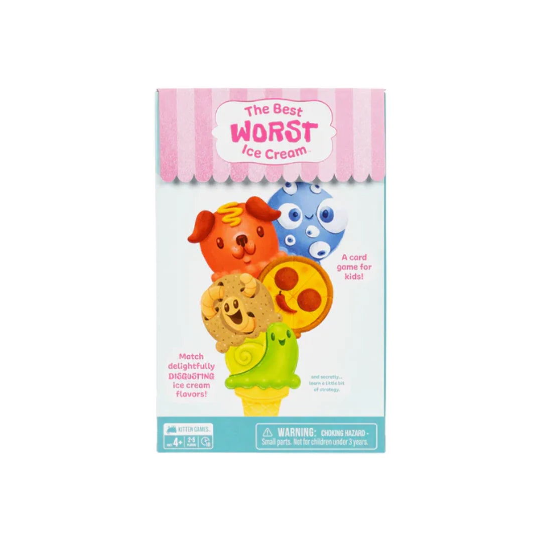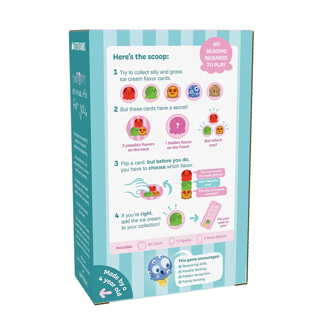 Watch kids improve their decision-making skills while building the kookiest Ice Cream Cone! They'l use reasoning and creative thinking to match flavors and fill their Ice Cream Cone, and you'll have fun playing along. It's easy to learn and fast to play with funky flavors that spark creative conversations. Play it as a two-player game or bring it to a party to get the giggles going