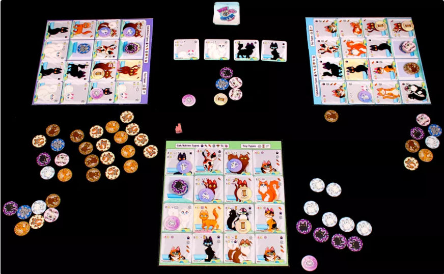 Way Too Many Cats is a competitive drafting spatial puzzle game about drafting cats, making each cat happy, and pressing your luck in the number of kittens you take on. Players are managers of an adoption agency trying to show off each cat in the best light. They accomplish this differently depending on the cat type and the individual characteristics of each cat. The game is played until one player fills all showcase spots in their adoption center; all players get equal turns and the player with the cutest cats wins!