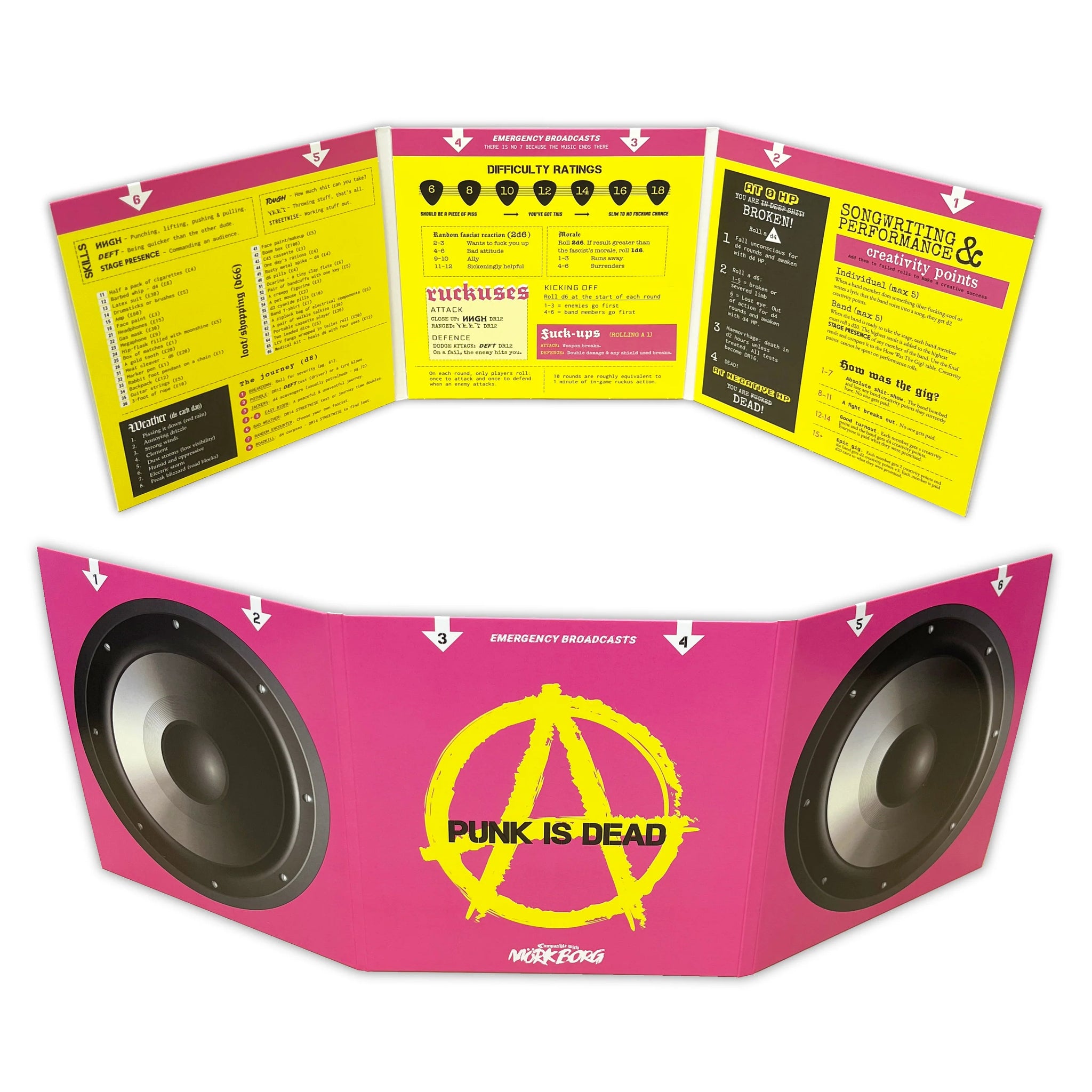 The official Band Manager screen for the Punk is Dead TTRPG. A seven-inch gatefold with Pantone colours to match the game book, handy reference on the BM facing side and sleeve to store notes or extend the screen.