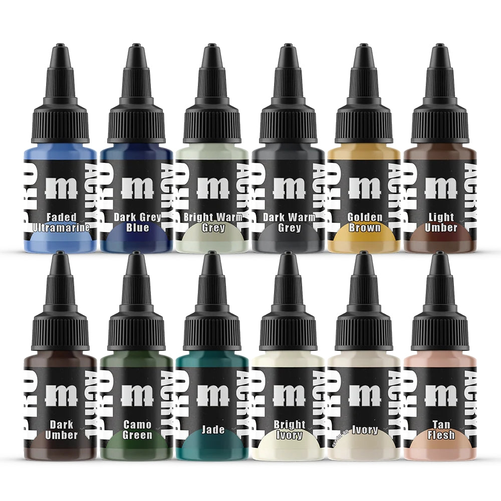 Bold Titanium White, Coal Black, Bold Pyrrole Red, Green, Blue, Golden Yellow, Orange, Burnt Red, Mahogany, Purple, Magenta, Sky Blue, Faded Ultramarine, Dark Grey Blue, Bright Warm Grey, Dark Warm Grey, Golden Brown, Light Umber, Dark Umber, Camo Green, Jade, Bright Ivory, Ivory, and Tan Flesh