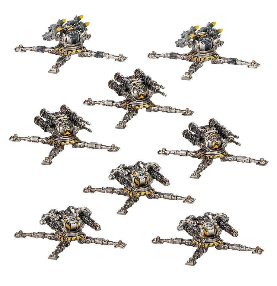 This multipart plastic kit builds eight Araknae Weapons Platform Batteries for your Legiones Astartes armies in games of Legions Imperialis. These defensive arrays are ideal for denying swathes of the battlefield to your enemy. Up to four can be armed with flexible quad accelerator autocannons, up to two can be equipped with Orias heavy frag missiles for taking out hordes of light infantry, and up to four can take twin punisher cannons for engaging light armour, flyers, and heavy infantry.