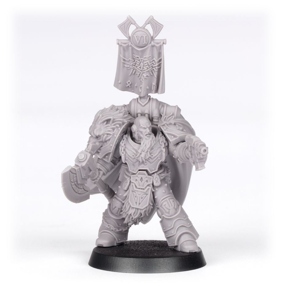 This multipart resin kit builds one Legion Praetor for the Space Wolves. He's equipped with a massive Fenrisian axe and bolt pistol, and wears armour decorated with fine Fenrisian craftsmanship to reinforce the VI Legion flavour. He further stands out from his brothers with a wolf-pelt cloak and backpack-mounted banner, a potent fighter and a proven leader who's ready to bolster the charge. You'll find both a helmeted head and a bare head sporting a very impressive beard.